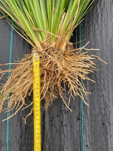Vetiver is a fast-growing perennial grass plant with an extensive, dense and deep root system. Since the vetiver root system does not have lateral roots (stolons nor rhizomes) it cannot move laterally. It cannot produce fertile seed, it does not spread naturally and is therefore not invasive. When planted close together it forms a dense narrow hedge. Its leaves and stems will grow up to 3 meter tall and its roots will grow downwards up to 6 meters. The roots have a tensile strength of 1/6 that of mild steel, and when planted in hedges will increase soil sheer strength by up to 45%.